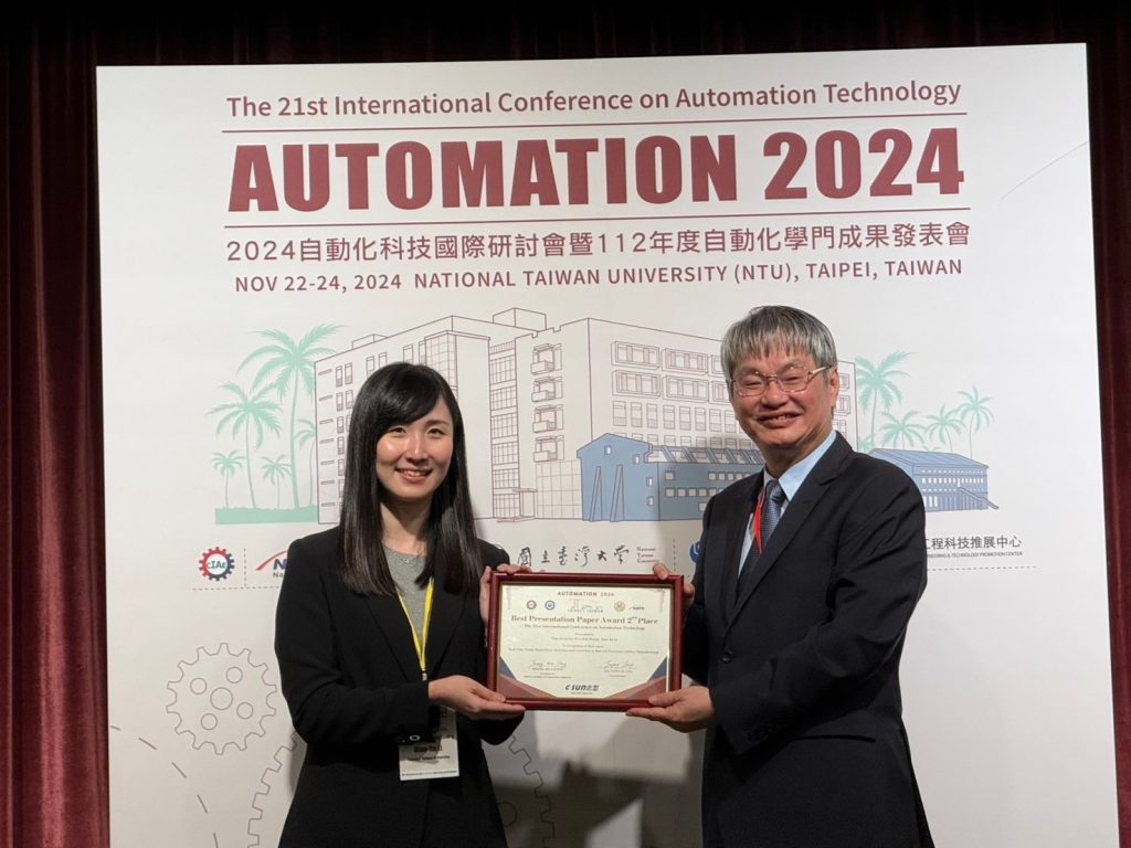李典儒教授於2024年11月22日至24日參與Automation 2024國際研討會,並發表題為「基於視覺的即時錯誤檢測與修正技術在材料擠出式增材製造中的應用」的研究論文。該研究聚焦於利用即時視覺技術提升3D列印過程中的錯誤檢測與修正能力,從而提高製造品質與穩定性。在本次研討會榮獲最佳論文簡報競賽 (Best Presentation Paper Contest)第二名的殊榮,特此恭賀!